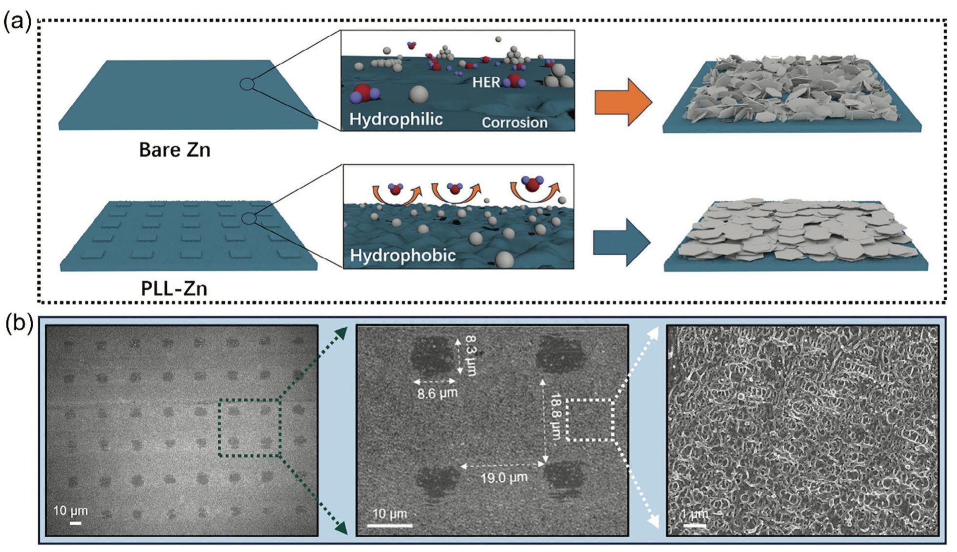 水系锌离子电池由于其低成本和安全性,成为具有潜力的大规模储能器件。然而,锌电极在实际应用中面临枝晶生长、析氢反应与腐蚀等问题,严重限制了电池的循环稳定性和寿命。研究团队创新性地采用皮秒激光光刻技术(Picosecond Laser Lithography, PLL)在锌电极表面构建周期性微纳疏水结构,该周期性微纳疏水结构减少了锌电极与电解液的直接接触,抑制了腐蚀和析氢反应发生并通过重构电场实现锌离子的有序沉积,显著提升锌离子电池性能。通过该方法制备的锌电极展现出优异的电化学性能,未来有望应用于大规模储能器件。