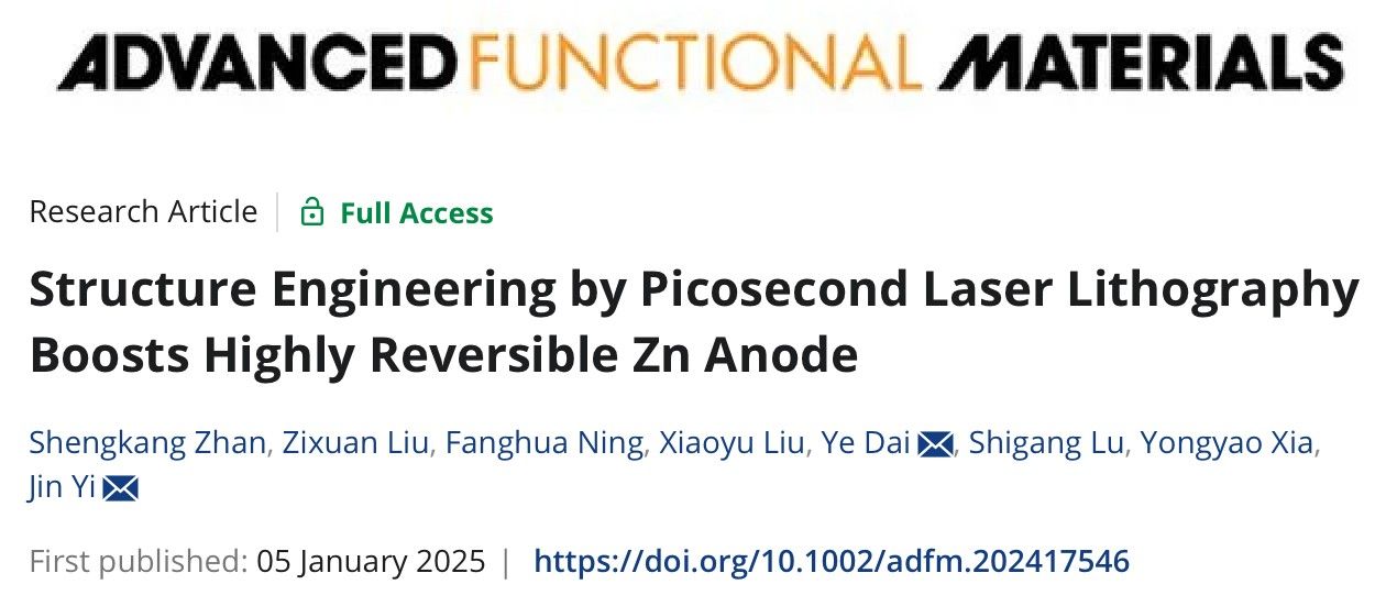 近日,365英国上市集团戴晔课题组和易金课题组在凝聚态物理与材料科学领域国际知名期刊《Advanced Functional Materials》上发表题为《Structure Engineering by Picosecond Laser Lithography Boosts Highly Reversible Zn Anode》的研究成果。365英国上市集团2021级硕士研究生占圣康与2020级钱伟长学院应用物理专业本科生刘子萱为论文共同第一作者,戴晔教授和易金研究员为共同通讯作者。英国365公司为第一作者单位和唯一通讯单位,复旦大学为合作单位。该工作得到了国家自然科学基金、上海市自然科学基金的资助。