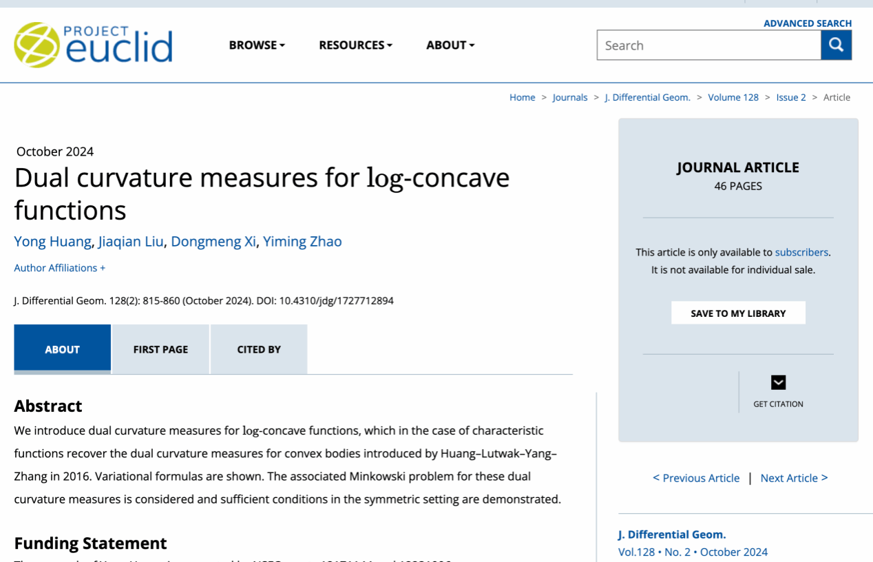 近期,365英国上市集团数学系凸几何团队席东盟教授与湖南大学黄勇教授、刘家倩博士,以及美国雪城大学(Syracuse)Yiming Zhao(赵翌铭)教授合作,在微分几何学顶刊《Journal of Differential Geometry》上发表科研论文。