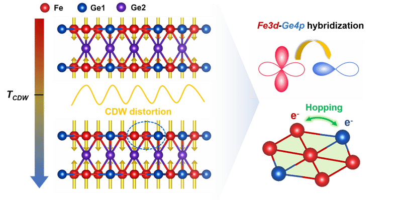 本项研究聚焦于量子材料笼目晶格中电荷密度波(CDW)与磁有序之间的耦合机制问题。以笼目反铁磁体FeGe为研究对象,结合X射线吸收谱实验技术和第一性原理计算,系统揭示了Fe 3d轨道与Ge 4p轨道之间的杂化行为在CDW相变过程中的动态演化。研究结果发现,该轨道杂化强度在CDW转变过程中显著减弱,并直接影响Fe原子的电子占据态,从而导致局域磁矩的非常规增强。这一工作创新性地引入轨道自由度作为理解电荷与磁有序耦合机制的关键变量,从原子尺度上揭示CDW相变驱动Fe原子自旋态变化,强调了轨道杂化效应在调控磁特性中的关键作用。该研究成果为量子态调控、自旋电子学及新型反铁磁材料的研究提供了全新的物理视角与实验依据,标志着笼目量子材料研究的一个重要突破。