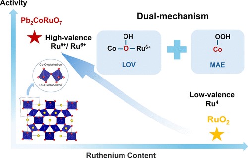 本研究重点关注一种含Ru⁶⁺的OER催化剂(Pb₂CoRuO₇)。该催化剂在1.0 M KOH溶液中表现出超低的过电位(在10 mA cm⁻²电流密度下仅为176 mV)和塔菲尔斜率(30.52 mV dec⁻¹),性能远超基准催化剂RuO₂(在10 mA cm⁻²下过电位为340 mV,塔菲尔斜率为111.54 mV dec⁻¹)。原位X射线吸收实验观察到,反应过程中Ru⁵⁺离子逐渐转化为高价态Ru⁶⁺,同时部分Co³⁺离子氧化为Co⁴⁺。密度泛函理论(DFT)计算揭示,Pb₂CoRuO₇的超高OER活性源于其独特的双机制协同作用:在钴(Co)位点遵循金属位点吸附质演化机制(MAE),而高价态Ru⁶⁺则与钴通过晶格氧空位位点机制(LOV)协同作用。这项工作展示了一种新型且独特的OER催化剂,其催化活性由MAE与LOV机制的协同效应共同驱动。