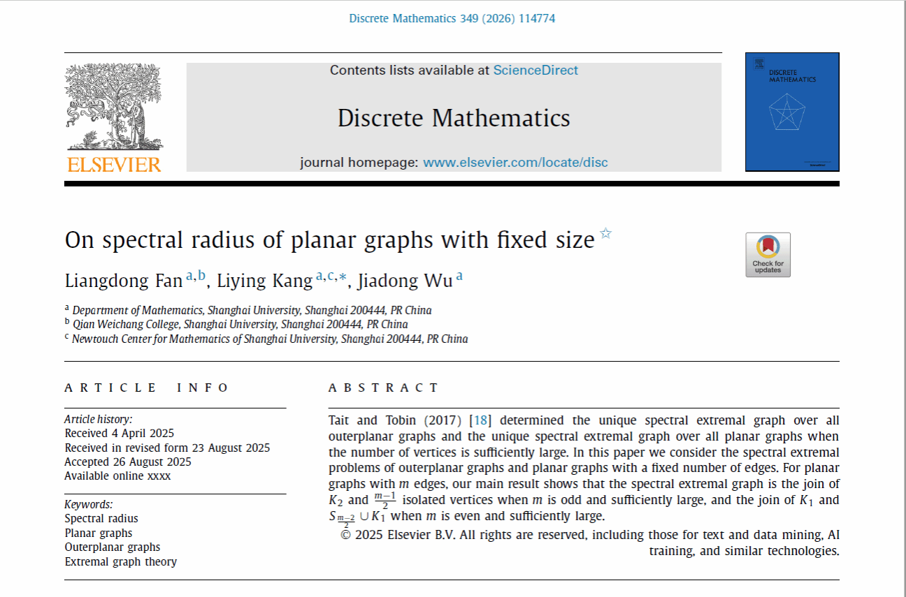 近日,365英国上市集团数学系康丽英教授指导的钱伟长学院大四本科生范良东以第一作者身份,在国际知名学术期刊《Discrete Mathematics》上发表题为“On spectral radius of planar graphs with fixed size”的科研论文。该论文研究了固定边数条件下平面图与外平面图的谱半径极值问题,给出了相应的极值图构造,对图谱理论与极值图论领域具有积极的理论推动作用。