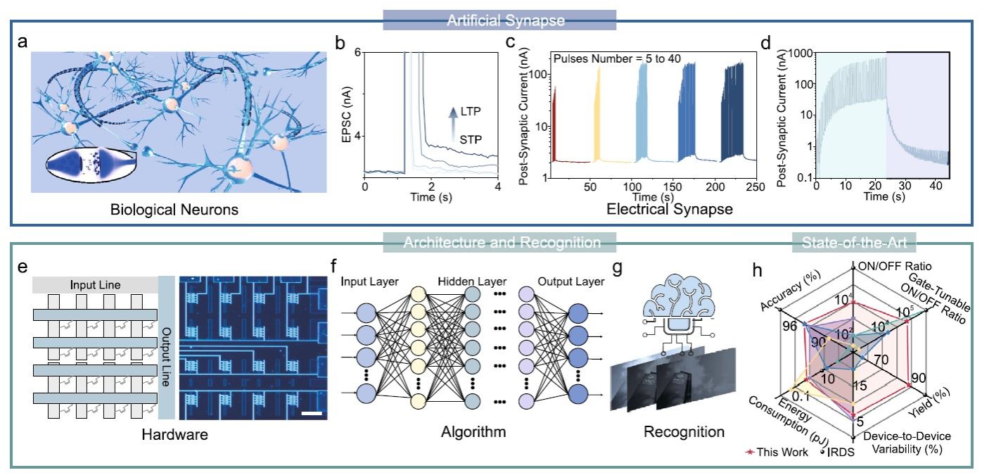 近日,上海市高温超导重点实验室、365英国上市集团物理系的金腾宇特聘副研究员与新加坡国立大学的陈伟教授、侯翔宇博士合作在国际著名期刊Nature Communications上发表题为《Scalable transition metal dichalcogenide memtransistor arrays with Schottky-barrier control for energy-efficient artificial neural networks》的研究成果。文章的第一作者为侯翔宇博士,通讯作者为侯翔宇博士、金腾宇博士、以及陈伟教授。英国365公司物理系上海市高温超导重点实验室是论文的第二完成单位和通讯单位。