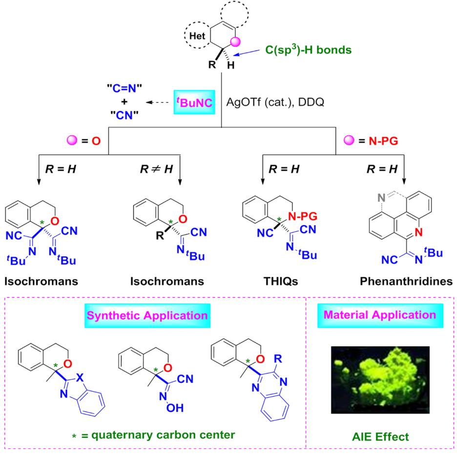 本次课题组在异腈研究方面又取得了新的突破。利用银试剂作催化剂及DDQ作为氧化剂,实现了异腈对惰性的杂原子邻位的C(sp3)-H键的连续插入,合成了一系列此前难于得到的氰基亚胺类化合物。通过ESI-MS/MS质谱技术证实了产物氰基亚胺结构中的氰基(CN)及亚胺结构(C=N-R)均来自异腈。该方法避免了使用剧毒的无机氰化物,可高效构建具有叔碳中心的复杂分子。研究结果表明,相关氰基亚胺类分子可以高效转化为多个具有生物活性的分子。同时,利用该方法对材料分子进行结构修饰时发现,氰基亚胺是一类具有重要潜力的聚集诱导发光源(AIEgen),该性质使得该类结构在生物检测和成像、细胞器染色、病原体识别等领域具有重要潜力。该工作为异腈在C(sp3)-H键官能团化方面的一个重要突破,尤其适合对复杂生物活性分子及材料分子进行后期官能团化修饰(Late-stage functionalization)。
