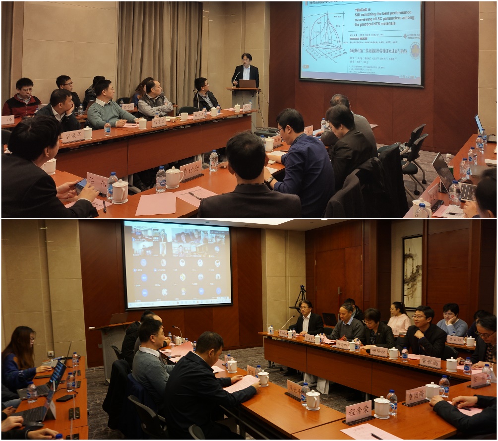 蔡传兵教授汇报了实验室本年度总体进展情况以及下一阶段发展规划。随后,实验室六名青年骨干教师查国桥、葛军饴、刘志勇、周迪帆、范峰、蔡文赫就各自研究方向分别作了题为“具有竞争配对序的超导体系中拓扑缺陷态研究”、“FeSeTe薄膜超导电性及临界厚度的研究”、“化学法涂层导体超导层的性能提升进展”、“高温超导块材制备及磁化研究”、“黑洞物理与高温超导”、“离子辅助沉积织构技术及其在涂层导体中的应用”的学术报告,详细介绍了各自近期在超导及其相关领域取得的特色研究成果。