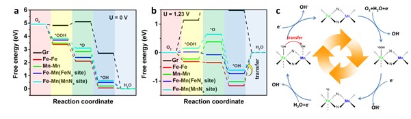 图2 DFT第一性原理模拟计算Fe/Mn-N-C (Mn-Nx位点)上的ORR过程自由能变化路径Fe/Mn-N-C上ORR过程示意图