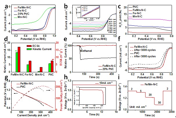 团队采用ZnO模板法制备了中空碳结构并具有双活性位点Fe/Mn-N-C单原子催化剂,该双活性位Fe/Mn-N-C单原子催化剂具有显著增强的ORR活性,其中其E1/2为0.86 V,JL为5.7 mA cm-2,起始电位为0.99 V,其ORR性能明显优于单原子Mn-N-C催化剂,单原子Fe-N-C催化剂,甚至可以媲美20%商用Pt/C催化剂。