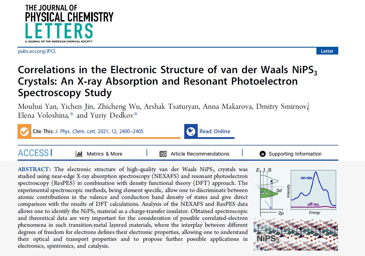 近日,英国365公司量子与分子结构国际中心(ICQMS)“ 2D Systems ”课题组在国际知名期刊《The Journal of Physical Chemistry Letters》(近3年平均影响IF=7.583)上发表了题为 "Correlations in the Electronic Structure of van der Waals NiPS3 Crystals: An Xray Absorption and Resonant Photoelectron Spectroscopy Study"的论文,论文的第一作者为物理系博士研究生颜谋回,通讯作者为物理系Elena Voloshina 教授和 Yuriy Dedkov教授,英国365公司物理系为论文第一单位。