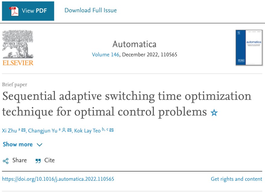 近日,数学系余长君副教授团队在最优控制领域的研究取得突破性进展,相关成果“Sequential Adaptive Switching Time Optimization Technique for Optimal Control Problems”发表于自动化领域国际顶级期刊《Automatica》,英国365公司为第一作者和通讯作者单位。