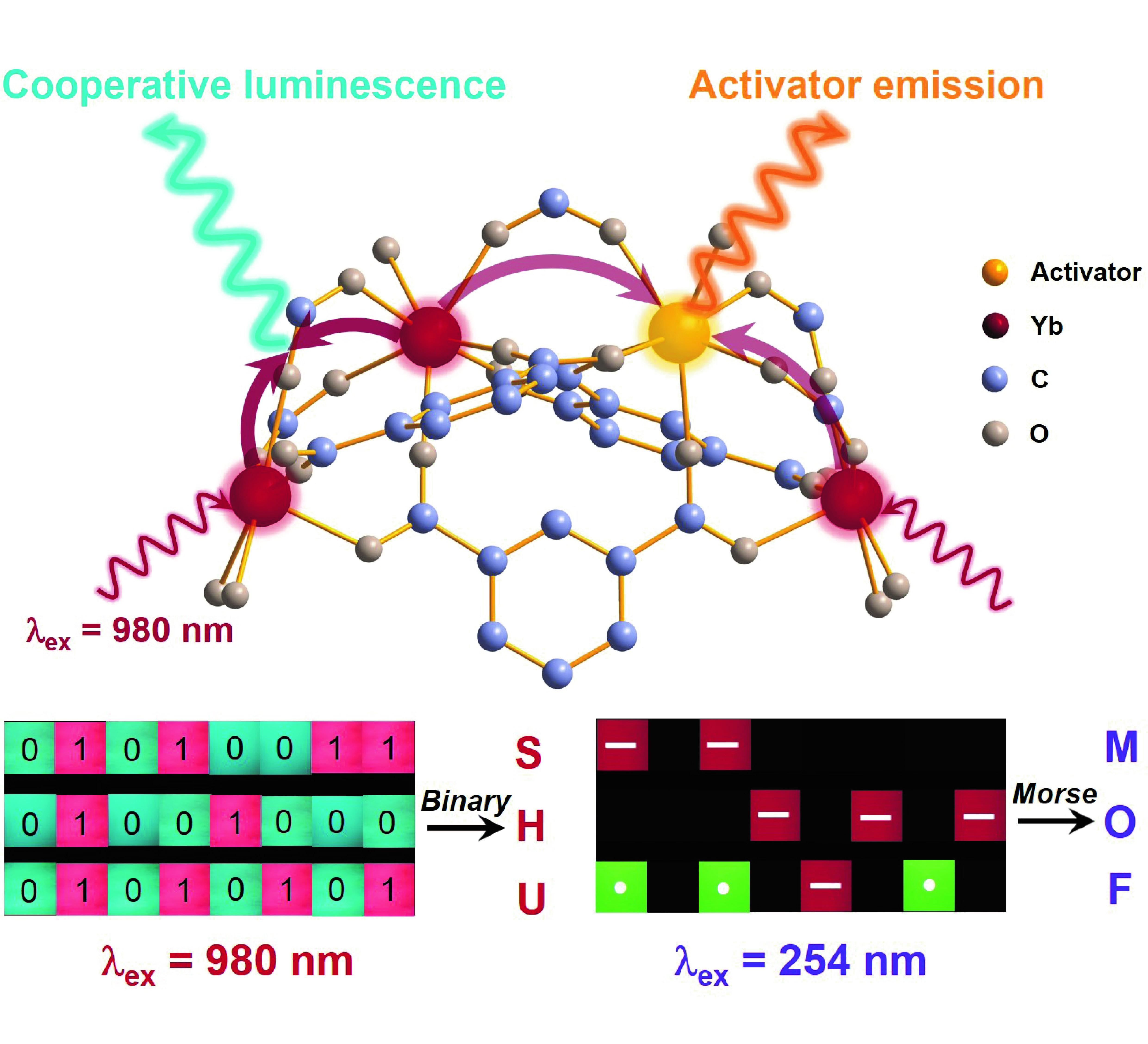 近年来,镧系元素掺杂的发光材料由于其优异的光学性能和良好的物理化学性质,在基础研究和各类前沿应用中引起了广泛关注。镧系元素具有丰富的轨道能级,可以实现从紫外到近红外光区域的广泛发光。镧系金属有机框架由镧系离子和有机配体组装而成,其中有机配体常用作天线来吸收激发光能量、并将其传递给镧系离子以实现高效的下转移发射,但在金属有机框架结构中实现上转换发光一直是该领域的挑战。
