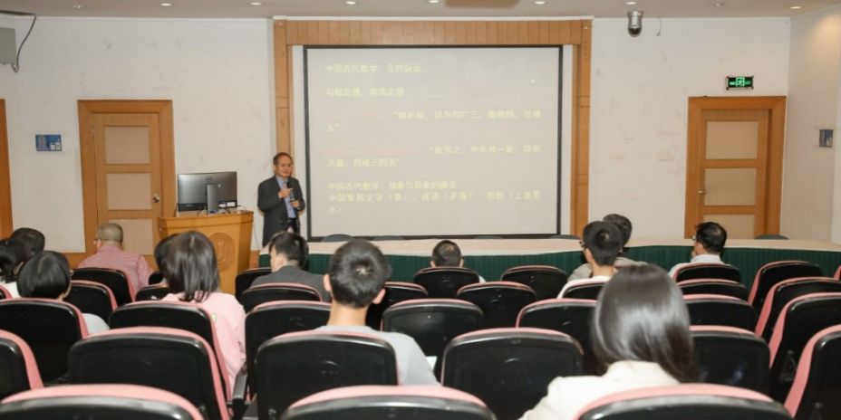 随后,数学大师讲坛第一讲开讲,周向宇院士在J103作了题为“从商高证明勾股定理谈起”的数学大师讲坛第一讲。周院士从华罗庚先生的名言“中华民族是擅长数学的民族”开始,指出中国古代在数学上做出了极为重要的贡献,并从古代数学、几何等角度等多方位阐述了中国古代数学思想。从商高折矩思想入手,说明了中国古代数学抽象与具体相结合的特点。本次讲座让我们看到了中国古代数学源远流长,在孟子、墨子、荀子、管子、韩非子等诸子人文思想中蕴含数学思想,对中国文化影响深远。通过讲座增强了学生的文化自信与爱国情怀,激发了学生的学习热情,对培养学生的科学素养起到了积极作用。