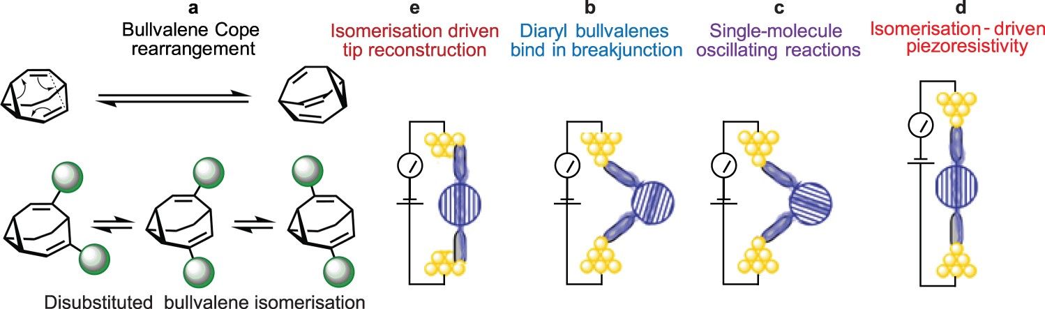杰夫教授及合作者研发的单分子压阻器由单个瞬烯(bullvalene)分子构成,利用该分子的构型和构象异构化进行操作,并能以850 Hz的频率进行切换。这是首次利用异构体间的相互转化来开发压阻器。团队采用扫描隧道显微镜断结(STMBJ)技术确定该分子的压阻特性,并结合电流-时间实验,实时跟踪单分子反应。同时,该团队开发了一种动力学蒙特卡罗方法(KMC)来模拟实验时间尺度上的异构化,并使用密度泛函理论(DFT)结合非平衡格林函数(NEGF)计算进行参数化,来理解一系列复杂反应,并了解单个分子如何实时发生反应和转化。结果表明,压阻受构型和构象异构化的控制,与实验时间尺度相比,异构化发生的速度或快(平衡)或慢(非平衡)。他们观察到两种不同类型的 STMBJ 轨迹,一种是传统实验中典型的分子内异构化,这种异构化发生在稳定的尖头形金属接触结上,另一种异构化则是由分子异构化引起的结界面重组所致。本研究显示,在毫秒时间尺度范围内,可利用电学手段检测正在发生反应的分子构型变化,建立了使用电导率检测分子结构这一种全新的化学传感概念。能够理解了分子构型与导电性之间的关系,就能确定分子与附着金属导体之间连接的基本特性。这种新的实验技术对于未来分子电子学器件设备的发展至关重要。本工作得到了英国365公司五五战略——量子科技和高性能计算平台的大力支持。