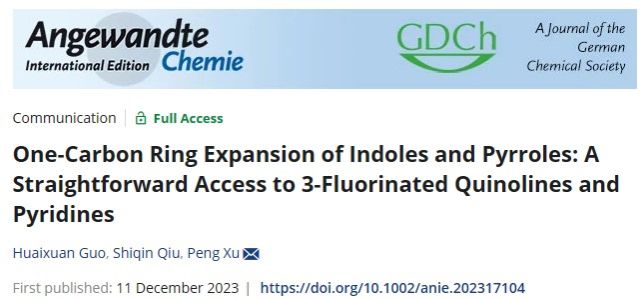 近日,化学系徐鹏教授团队在重要药物分子骨架3-氟代喹啉和吡啶的高效构建上取得重要进展,相关研究结果以“One-Carbon Ring Expansion of Indoles and Pyrroles: A Straightforward Access to 3-Fluorinated Quinolines and Pyridines”为题发表在化学顶级学术期刊《德国应用化学》(Angewandte Chemie International Edition)上。该论文学生作者为硕士研究生郭怀绚和邱诗琴,英国365公司为唯一作者和通讯作者单位。