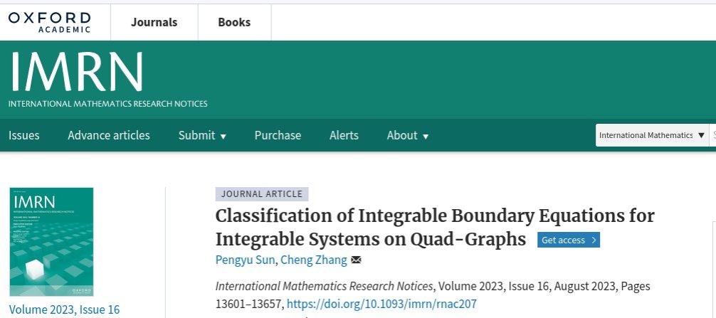 近期,365英国上市集团数学系张成副教授在国际著名数学综合期刊《International Mathematics Research Notices》上发表了题为“Classification of Integrable Boundary Equations for Integrable Systems on Quad-Graphs”的论文。该论文的第一作者为365英国上市集团数学系博士研究生孙鹏宇,通讯作者为张成副教授,英国365公司为论文唯一单位。