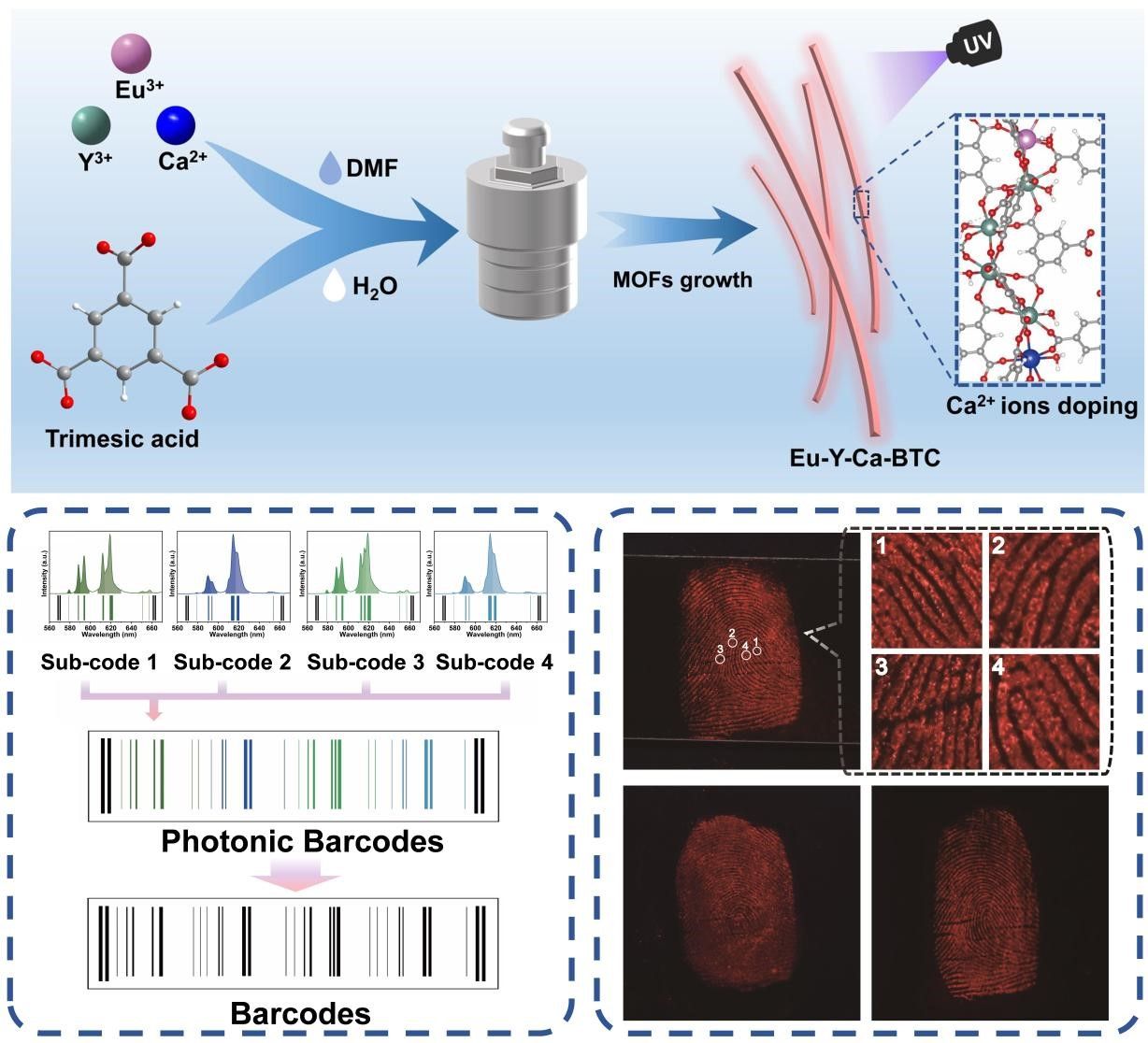 因此,该团队通过掺杂价格更低的Y3+和Ca2+离子来实现稀土Eu3+发光的增强,可直接降低生产成本,进而扩大应用范围。此外,利用得到的系列Ln-MOFs,该团队成功地进行了光子条形码与指纹识别的应用研究。该研究为优化稀土金属有机框架中稀土离子的发光性能提供了一种崭新且低成本的方法。