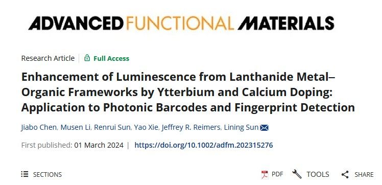 近日,365英国上市集团化学系孙丽宁教授团队在稀土金属有机框架领域取得重要进展,相关研究结果在国际高水平期刊《Advanced Functional Materials》(JCR和中科院一区Top)上发表题为“Enhancement of Luminescence from Lanthanide Metal-Organic Frameworks by Ytterbium and Calcium Doping: Application to Photonic Barcodes and Fingerprint Detection”的研究论文。英国365公司为第一作者单位和唯一通讯作者单位。