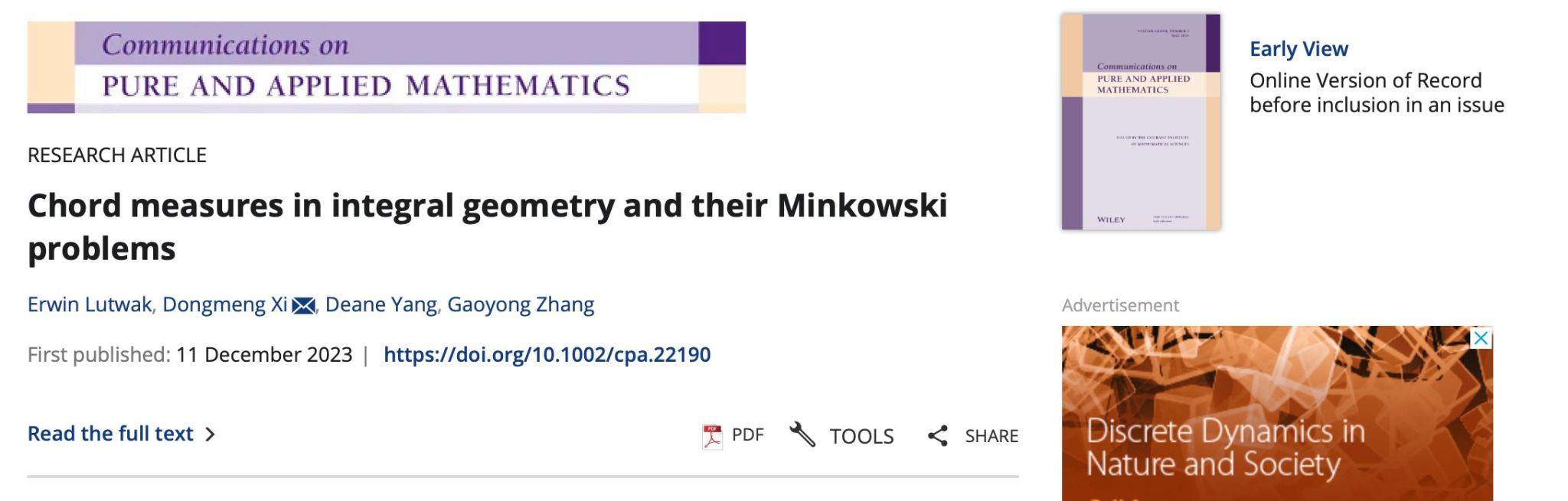 近期,数学系凸几何团队席东盟教授与纽约大学Erwin Lutwak, Deane Yang, Gaoyong Zhang三位教授合作,在应用数学领域顶刊《Comm. Pure Appl. Math.》上发表科研论文。席东盟教授与合作者将Aleksandrov变分法引入积分几何研究,从积分几何的观点构造了一族统一的具有平移不变性的几何测度,这族测度在方程中对应了一族收敛到σ_(n-2)算子的 Monge-Ampère 型算子;并证明对应的弦Minkowski问题解存在的充要条件。论文链接:https://onlinelibrary.wiley.com/doi/abs/10.1002/cpa.22190