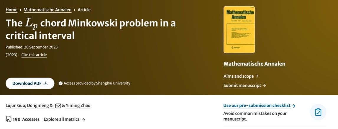 另外,席东盟教授与河南师范大学郭路军教授、美国雪城大学Yiming Zhao教授合作,继续研究积分几何中的Minkowski问题,解决了指标p属于[0,1)区间的Lp弦Minkowski问题(具有奇异性的一类情形)。相关科研成果发表在国际知名期刊-德国数学年刊《Math. Ann.》上。论文链接:https://doi.org/10.1007/s00208-023-02721-8