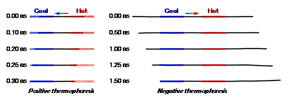 他们通过研究嵌套于不同温度的两根纳米管(外管)中的单壁碳纳米管(内管)的定向运动,发现内管的运动方向依赖于其长度:内管较短(端部包含于外管之内)时,发生正热泳现象(内管向低温方向运动,如左图所示);内管较长(两端伸出外管)时,则会发生负热泳现象(内管向高温的外管方向运动,如右图所示)。细致的数值分析显示这两种现象的运动机理完全不同。对于正热泳,层间吸附力和的边界力为驱动力,而对于负热泳,驱动力主要源自热梯度力。基于力学模型的理论结果进一步验证了以上机理。结构依赖的正负热泳现象对纳尺度驱动和能量转换具有重要的应用价值。