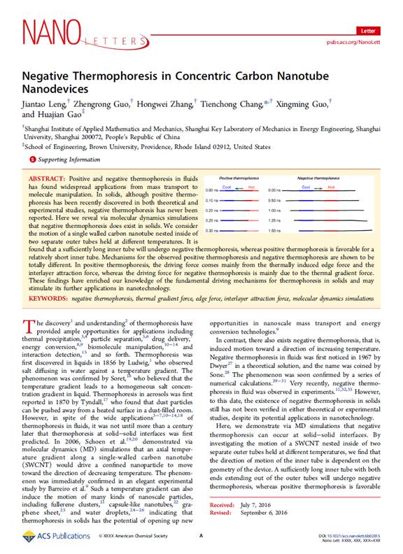 上海市应用数学和力学研究所2014级硕士研究生冷建涛作为第一作者在国际著名刊物《Nano Letters》(影响因子13.779)在线发表了关于固体间负热泳的论文。