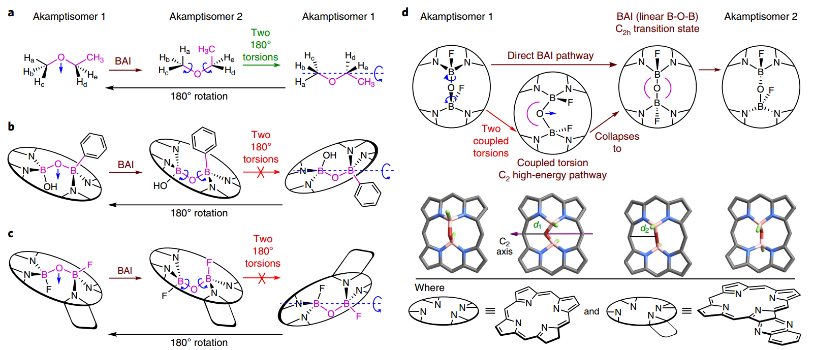 同分异构(isomerism)是一个重要的基本的化学概念,是指"两种或两种以上的化合物,具有相同的化学式,但结构性质均不相同"的现象,对于人们理解分子中原子排列对其化学和物理性质有深远影响。已知的同分异构类型包括构造异构、立体异构,后者又分为构型异构与构象异构。在这篇文章中,Reimers教授及其合作者结合实验与理论计算研究了(BF)O(BF)的四种立体异构体,描述了一种此前从未被分类的构象异构的基本形式。两对对映异构体间表现出的结构对应关系超出了国际理论和应用化学联会(IUPAC)现有的命名规则和术语体系,二者之间的非对映转换势垒为104kJ/mol,被Reimers教授等命名为阻弯异构(akamptisomerization, i.e. "cannot bend" 来自希腊语中的akamptos, 意为 "不灵活的,不曲的")。他们使用密度泛函理论计算得到合成产物与反应中间产物之间的可行转换过程,并确定反应机理为单键原子的键角反转(bond-angle inversion),同时引入了必要的键角反转立体描述符。由键角反转导致的阻弯异构是构象异构化的最后一种基本类型,与此平行的科研成果是在1914年发现的阻转异构化(atropisomerism)。阻弯异构扩展了IUPAC的异构化分类规则,被预计广泛存在于某些大环分子中,是一项教科书式的重要发现。而且,它为化学研究提供了一个新维度,据此可以容易地合成成千上万种相关化合物,具有广泛深远的科技应用价值。