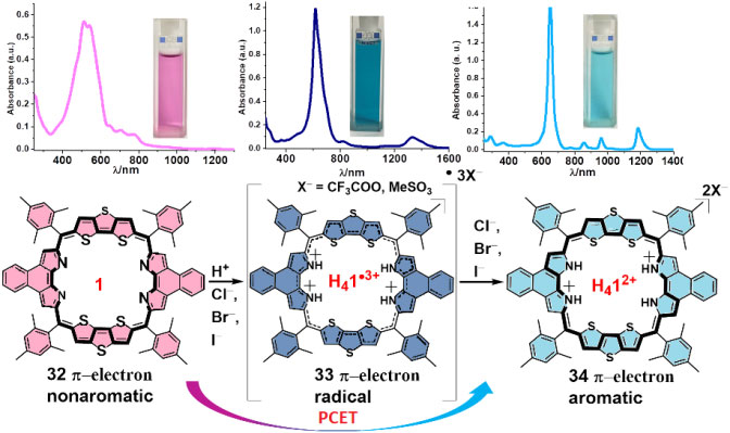 超分子化学作为研究复杂生物体系的重要手段,对于生命现象的认识及其内在本质的理解具有重要的意义。最近,365英国上市集团化学系超分子化学与催化研究中心Jonathan L. Sessler课题组通过对八卟啉结构核心的修饰,合成得到新颖的刚性扩展卟啉;并通过质子酸的调控,在该体系中成功再现了质子偶合电荷转移过程。该研究首次证实了卟啉结构的刚性构象对其PCET性质具有决定性的影响,为深入理解生物体系中PCET现象提供了模型参考,同时该卟啉体系也可实现对一系列富电子小分子的氧化,在有机合成催化领域展现出诱人的应用前景。论文以"Proton-Coupled Redox Switching in an Annulated π–Extended Core-Modified Octaphyrin"为题,发表于化学顶级期刊《美国化学会志》(Journal of the American Chemical Society)上。