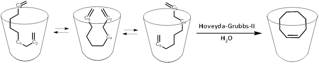 环状化合物在现代有机化学中占有着重要的地位。由于环状结构广泛存在于各种天然产物和药物分子中,因此,对于这类化合物的合成及其重要。而中环化合物中存在着不利的跨环张力及熵效应,导致中环化合物(七-九元环)的合成至今仍然是一个巨大的挑战。在本研究工作中,该研究团队利用水溶性杯状超分子反应器的空腔模拟酶的口袋,通过增水效应使远程的双烯化合物进入其空腔,创造性地使得两个端烯官能团相互靠近,从而在Hoveyda-Grubbs-II催化剂作用下发生烯烃复分解反应。该工作是首例利用超分子反应器空腔的内部结构,使反应物空间结构预组织,克服跨环张力及熵效应,成功合成中环化合物。