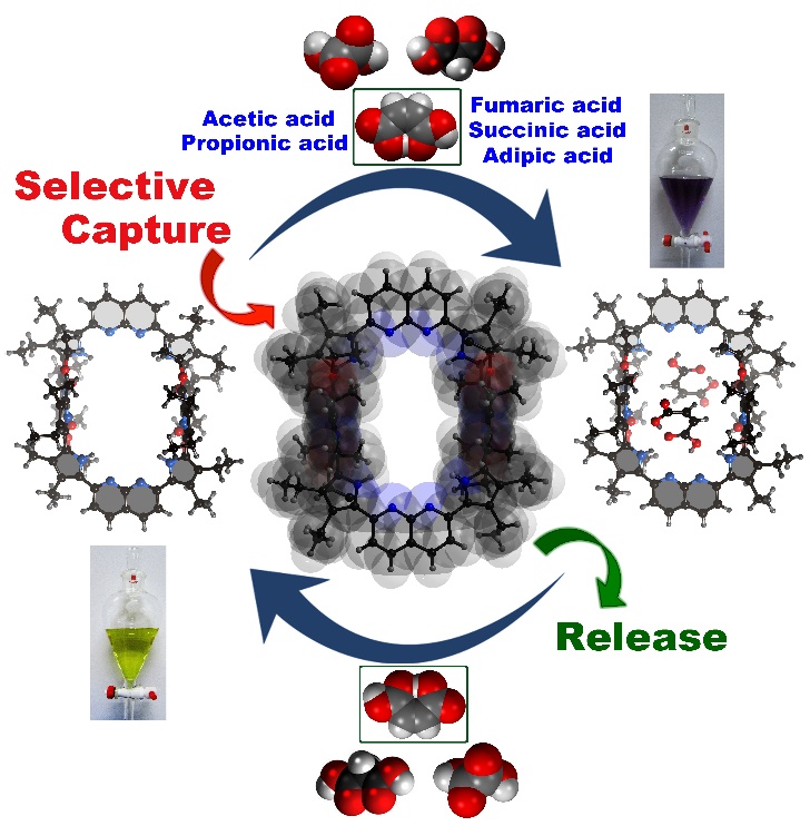 通过自组装策略构建复杂的功能化组装体是当前超分子化学领域的研究热点。在这一领域,通过金属配位的方式来实现分子笼的构建已经取得了较好的发展。然而,纯有机组装基元参与的自组装分子笼的研究还远远不够完善。针对这一挑战,研究团队设计合成了新型“四吡咯−1,8-萘啶”组装基元,该基元通过分子间氢键作用自组装形成笼状的大环二聚体。研究表明,这种二聚体分子笼在固态、液态、气态下均能保持稳定,甚至在强酸条件下也能稳定存在。同时,该分子笼在四丁基氟化铵的作用下能够实现解组装,用水洗涤后组装体又能够重新形成。这种组装和解组装过程可以重复进行20次以上,且几乎没有降解迹象。在此基础上,基于质子耦合阴离子识别作用,研究团队进一步实现了该分子笼对人体生理学中起着重要作用的二元羧酸的高效“捕获”和“释放”(如草酸能够在人体内通过形成草酸钙而导致关节疼痛和肾功能衰竭)。