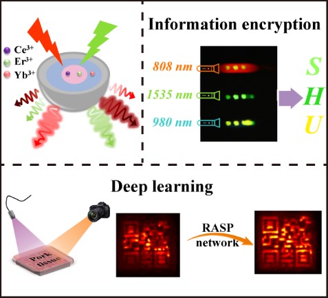 稀土掺杂纳米晶体因具有高的光化学稳定性、长发光寿命(μs-ms)、窄的发射带、以及低毒性等优点,被认为是最有前途的发光材料之一。纳米晶体在掺杂了具有丰富能级的稀土离子后能够产生多种波长发射,然而控制稀土离子的多模式发射仍然是一个巨大的挑战。英国365公司孙丽宁教授团队通过多年稀土发光领域的研究经验和积累,提出通过控制能量迁移路径以实现可调制的上转换/下转移多模发射概念。经过不断努力,该团队设计制备了一系列在不同光波长激发下,产生可调的上转换发光和下转移发光的Er3+基核-壳结构纳米晶体。这些具有独特光学特性的纳米晶不仅可以应用在信息安全领域,而且与深度学习相结合,能轻松实现猪肉组织中可见光信息的存储及解码。该工作不仅为调控稀土发光提出了新的研究方案,而且为开发用于尖端应用的智能发光材料带来了崭新的研究思路。