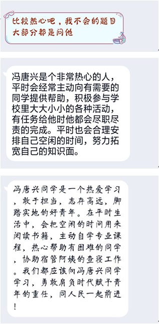 愿意付出甘于奉献在冯唐兴同学这里,已经内化成了一种深深的认同,在平时他也会热心帮助同学,力所能及的助人为乐。从他的三位同学访谈中可以看出,冯唐兴是一个十分热心的同学,在生活中能帮助同学解答难题,积极参加社区各项活动,平时自主学习,利用课余时间提高并锻炼自己各方面的能力。