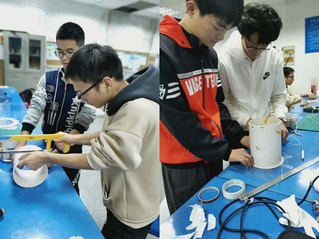 10月中下旬,小组开始进入实验室制作实验装置。首先是磁芯的制备,这时遇到了一个难题,购得的软磁材料为一个个小长方体,为了更好地增强磁场,要制作一个柱形磁芯。经过小组协商决定先在桌面上把长方体并列平放一排置,然后用胶带宽松粘贴,再立起来,围成一个圆柱体,首尾相接端用胶带粘牢,在软磁材料上表面涂上AB胶之后,再倒置放在亚克力板上。制备完磁芯之后是线圈的绕制,他们分别绕了两组平面型圆形线圈和柱形线圈。绕制柱形线圈时,由于没有合适的承载物,吴传易同学用手锯将长圆柱管锯成合适的长度用来承载线圈;绕制平面线圈需要边绕边固定,这样才能绕出优质的线圈。宁中锋想出以亚克力板为平面,以圆筒外围为起始圈,绕前在板上贴双面胶的方法,由郭若洋和张灿宇动手实现。大家齐心协力,两人一组一起完成了线圈的绕制,绕完后用胶带再次固定导线。