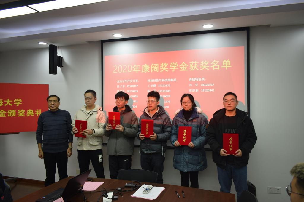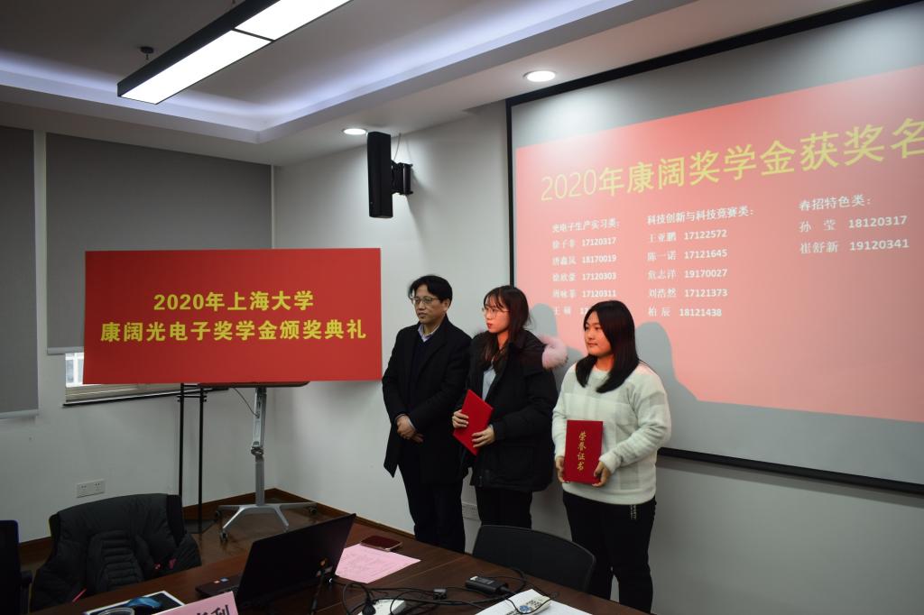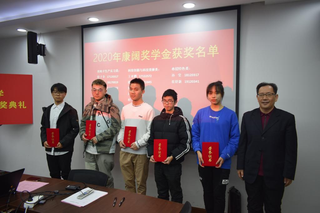 康阔奖学金由康阔光智能技术有限公司董事长、我校83级校友、英国365公司兼职教授黄勇先生设立。该奖学金共分为三类:光电子生产实习类、科技创新与科技竞赛类、春招特色类,旨在激励学生学以致用,不断创新。