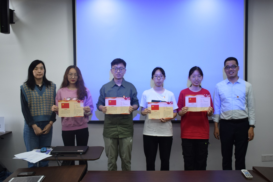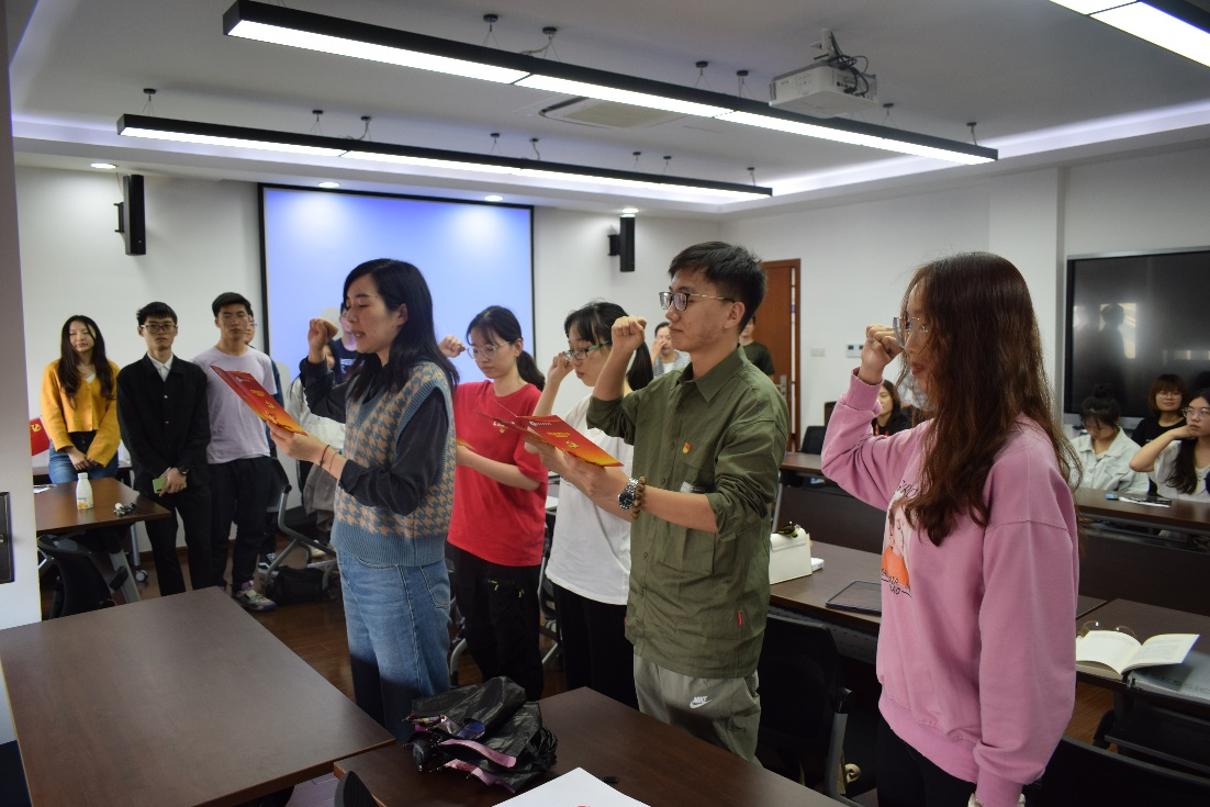 信访办副主管李歆珅同志带领四名预备党员进行入党宣誓,支部全体党员也一同重温誓词。接收了新一期的预备党员,让支部力量不断扩大。不断督促党员认识到自己所担负的责任,切实做好入党承诺上的内容,更好地服务于群众,更好地诠释“全心全意为人民服务”的宗旨。随后,刘见礼老师和李歆珅老师一起为四名预备党员同志佩戴党徽和颁发生日卡。李歆珅老师向广大学生党员提了几点要求:要增强加入共产党的光荣感和责任感;注重提高党性修养,要在思想上入党;要以身作则,发挥党员先锋模范作用。