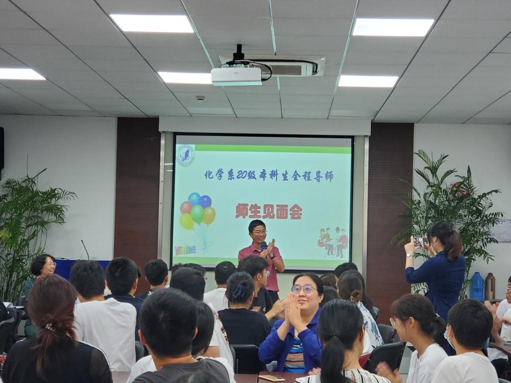 接下来,邢老师汇报了化学系全程导师制度的实施情况,也介绍了化学系导师的研究方向和学科领域,并邀请教师代表介绍自己的科研方向。接下来是全程导师和同学们自由交流和互动的时间。同时,化学系也为同学们准备了一些点心和零食,师生们边吃边聊,温馨愉悦!