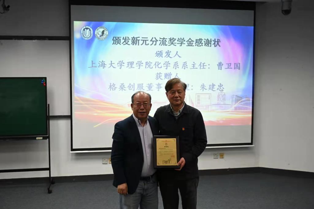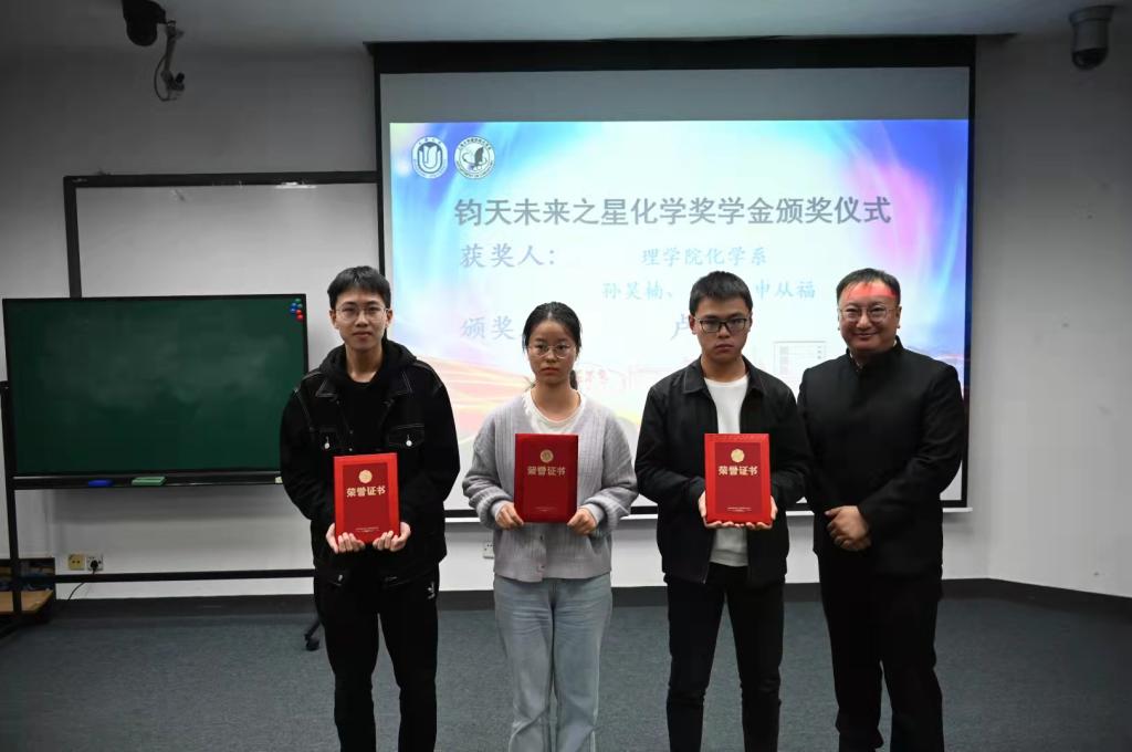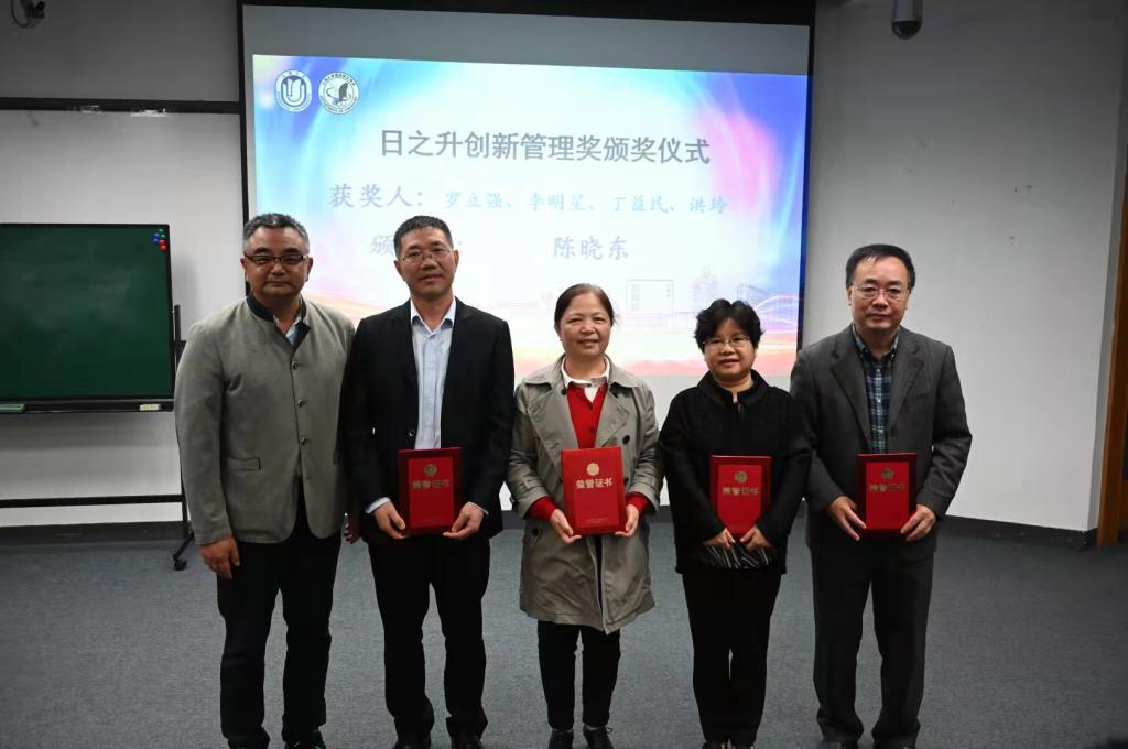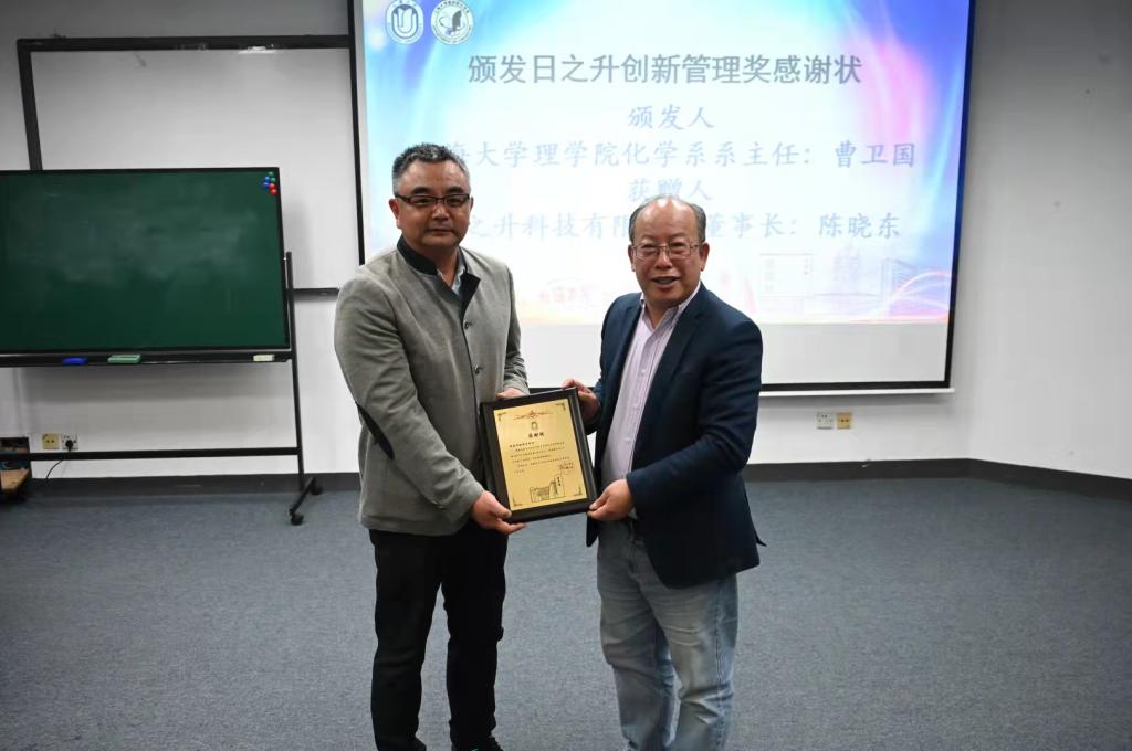 化学系87级校友、日之升科技有限公司董事长陈晓东先生为化学系设立了日之升创新管理奖,用于奖励化学系在学生培养中做出卓越贡献的优秀教师。陈晓东先生向辛勤育才的老师们表示感谢,同时向同学们提出了殷切希望,为获奖的老师们颁发荣誉证书。化学系系主任曹卫国教授为他颁发了感谢状。罗立强教授作为获奖教师代表发言,他回顾了化学系稳扎稳打的建设发展之路,对化学系多年来的各项工作表示充分的肯定,对化学系未来的发展充满希望。