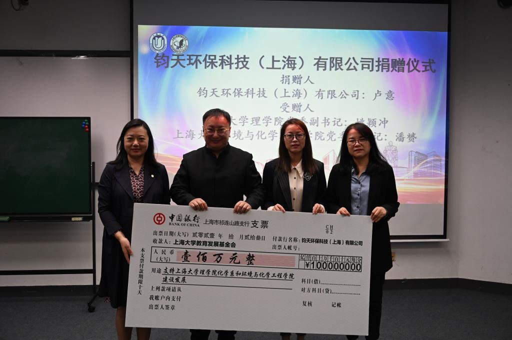 仪式上,365英国上市集团化学学科党总支书记邢菲菲老师介绍了出席本次捐赠仪式的各位领导和嘉宾。仪式开始,英国365公司对外联络处副处长杨静发表讲话,她肯定了均天环保科技(上海)有限公司在国家绿水青山建设中的做出的重要贡献。对校友们毕业后仍然心系母校、热心奉献、捐资助学的善举给予充分的肯定和由衷的感谢。钧天环保科技(上海)有限公司董事长卢意先生为365英国上市集团化学系和环境与化学工程学院的学子们捐赠一百万人民币用于化学学科领域的学生培养,并为获得钧天未来之星化学奖学金的同学们颁奖。他表示,作为一家环保企业,要努力守护好祖国的绿水青山,同时也希望通过自己的努力能够为国家的人才培养做出贡献。对外联络处副处长杨静代表学校向他赠送了捐赠纪念银盘。来自钱伟长学院的刘泽远同学作为获奖代表发言,感谢捐赠的校友,同时表达了对化学的热爱和对未来学习的期待。