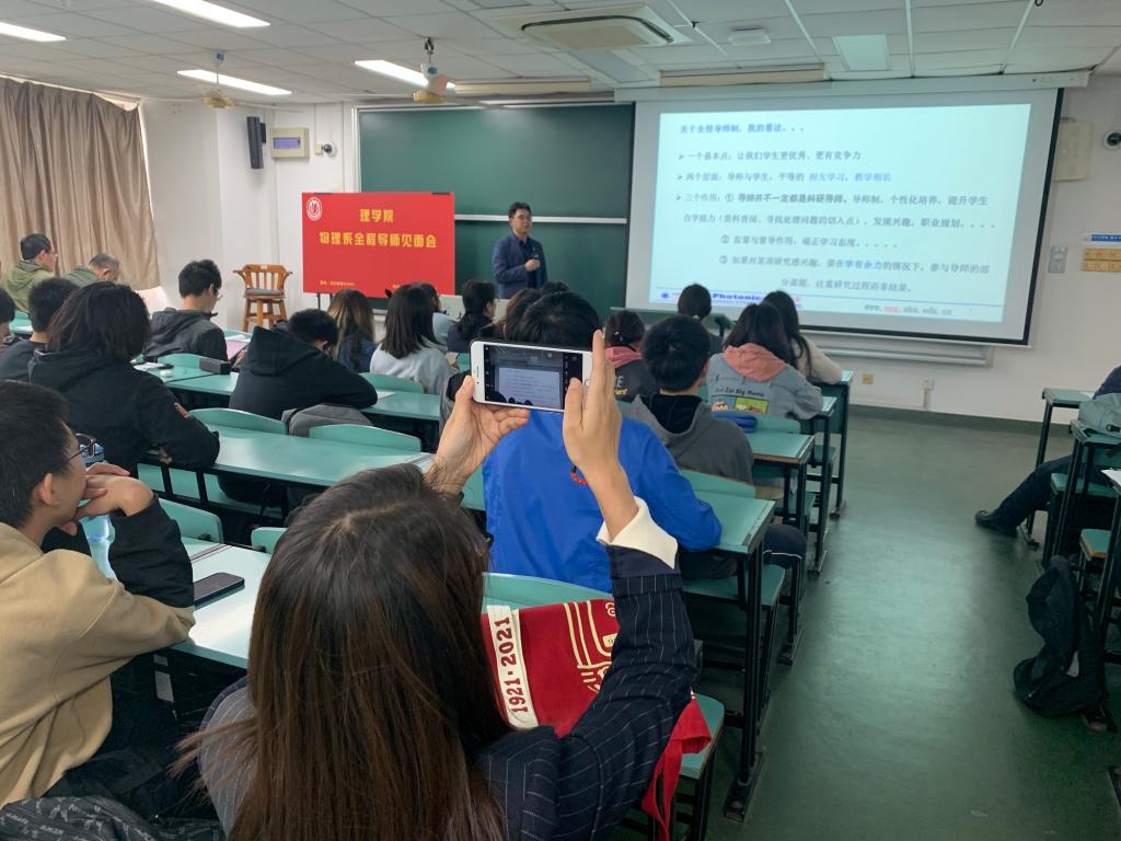 接下来,是物理系全程导师的自我介绍环节。来自应用物理专业和电子信息科学与技术专业的诸位导师都热情而细致地介绍了自己的研究方向、科研工作等,并且热忱地表示希望在学习、生活上能够陪伴同学们一起成长、进步。在介绍过程中,全体同学细心倾听、反响积极,大家都表示获益匪浅。