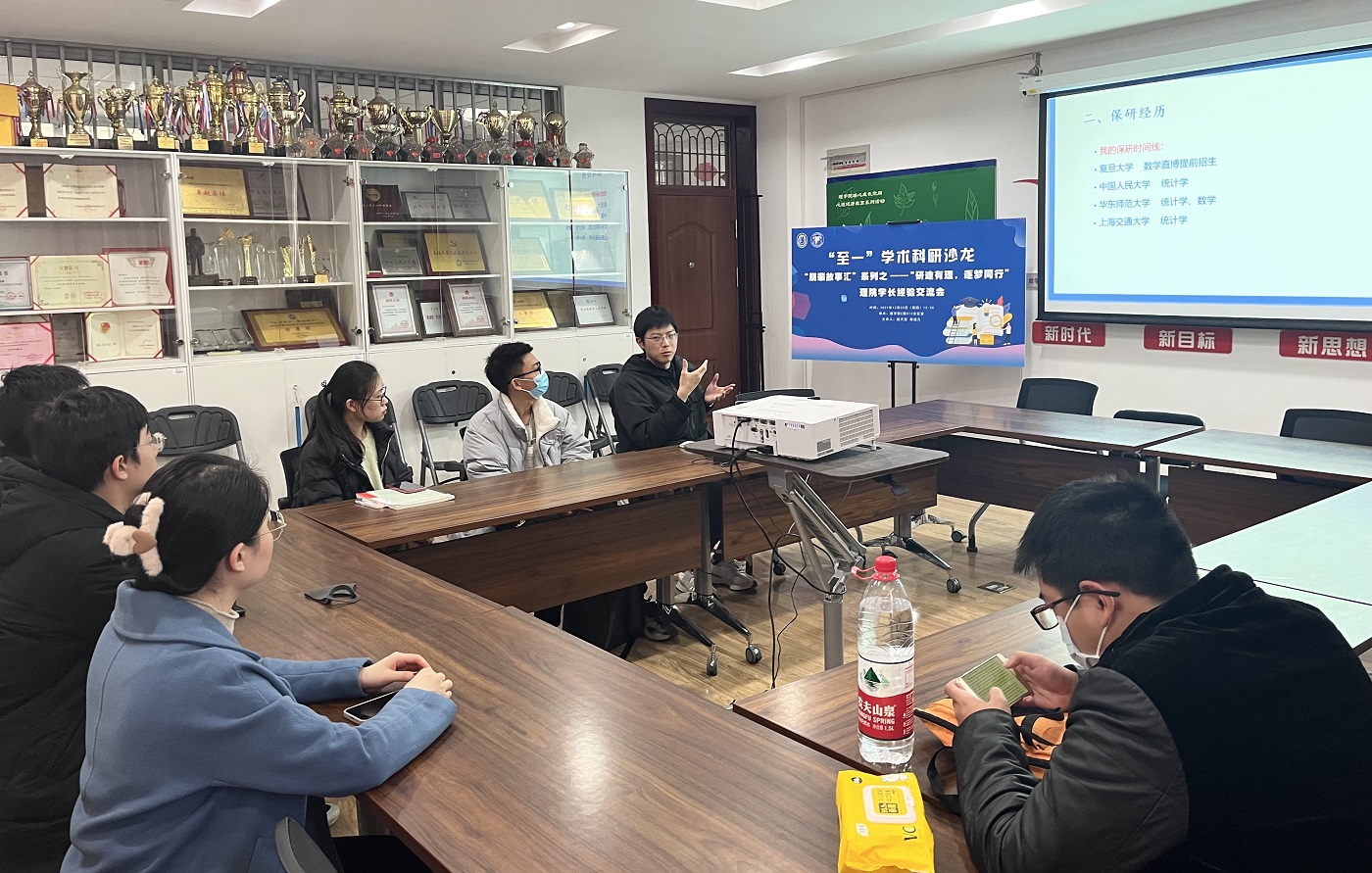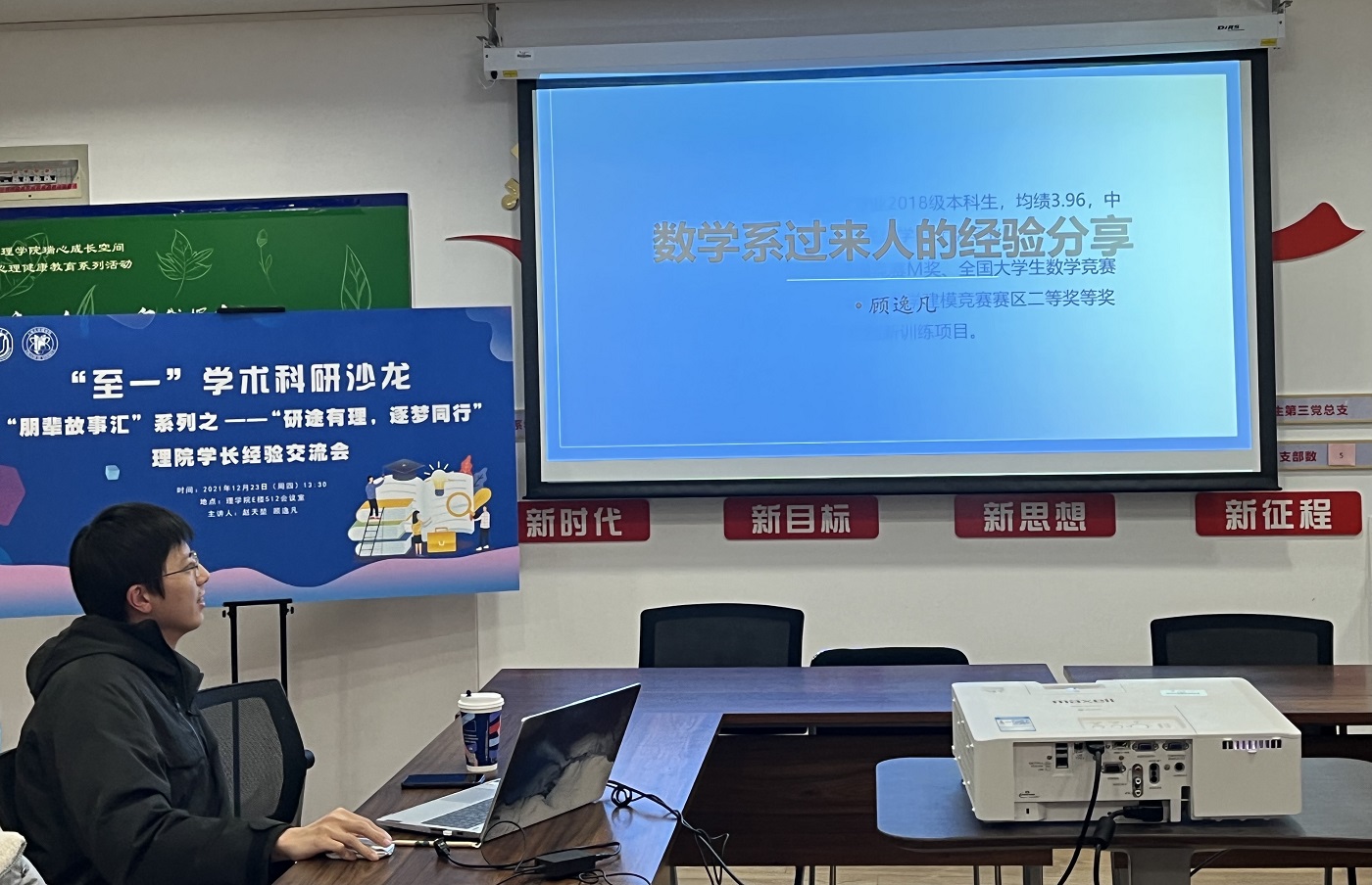 2021年12月23日下午,365英国上市集团学业发展中心于E楼512会议室举办了“至一”学术科研沙龙“朋辈故事汇”系列之——理院学长经验交流会,此次活动主题为“研途有理,逐梦同行”。交流会邀请到来自数学系17级的赵天堃和18级的顾逸凡就本科学习经验、考研、保研准备过程与经验做了详细的分享介绍,来自不同学院、不同年级的同学参加了此次交流会。