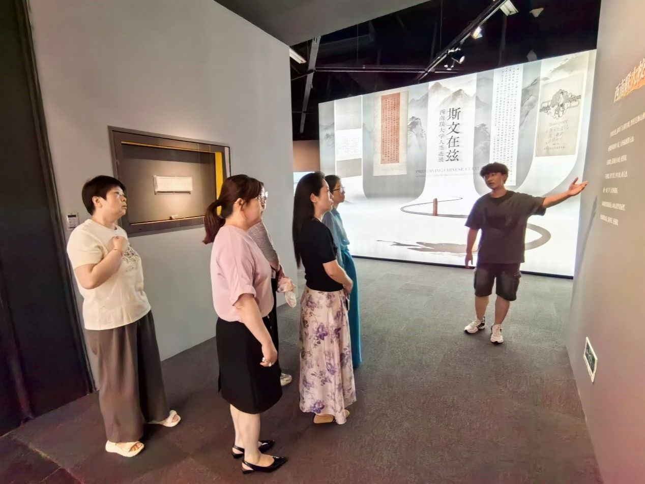 跟随讲解员,党员老师们走进“斯文在兹:西南联大学人墨迹展”,泛黄的信纸、遒劲的书法与隽永的文学作品,瞬间将大家带入那段烽火岁月。党员老师们久久驻足在西南联大师生写下的信件前,一字一句细细品读,透过书信中对学术的执着探讨、对家国命运的深切关怀,感受先辈们在艰难环境下依然坚守初心、不懈奋斗的精神;在书法与文学作品展区,大家被作品中传递出的坚韧品格和高尚情操深深打动。这些墨迹不仅是艺术瑰宝,更生动展现了西南联大在抗战烽火中弦歌不辍、赓续文脉的艰辛历程,以及联大师生们在极端艰苦条件下,坚守学术追求、弘扬爱国精神的崇高风范,其蕴含的勤俭节约、艰苦奋斗的优良作风,值得每一位党员老师学习与铭记。