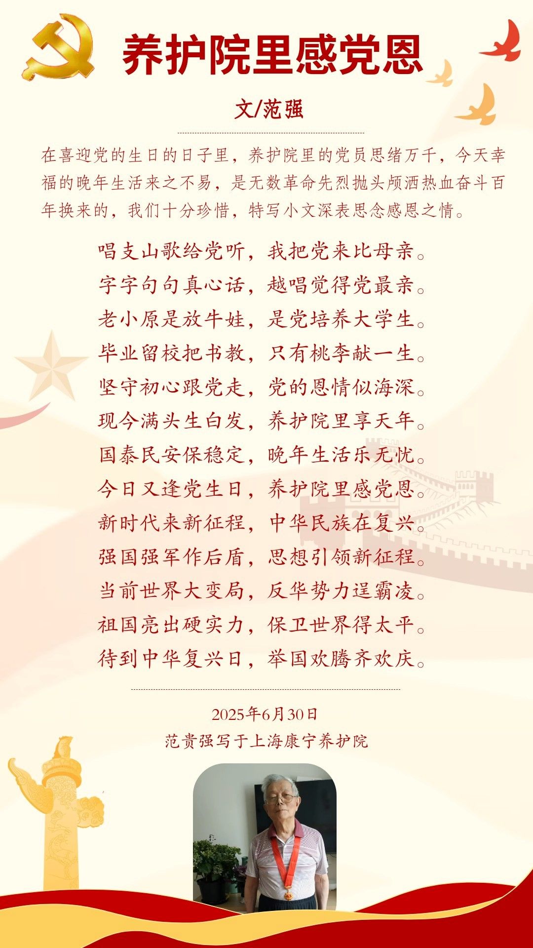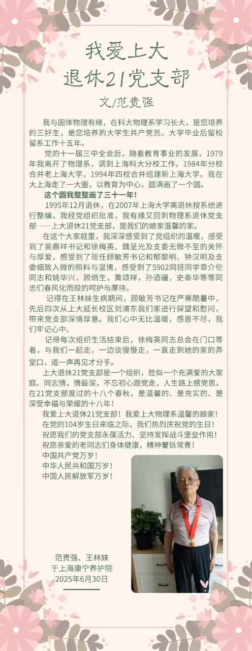 365英国上市集团物理系老党员,退休教师范贵强同志在2025年党的生日来临之际,思绪万千,结合自己的经历,表达思念感恩之情,主动向组织汇报自己的思想和学习小结。物理系全体党员在读到范老的文章后,纷纷表示感触颇深,并交流了感想。