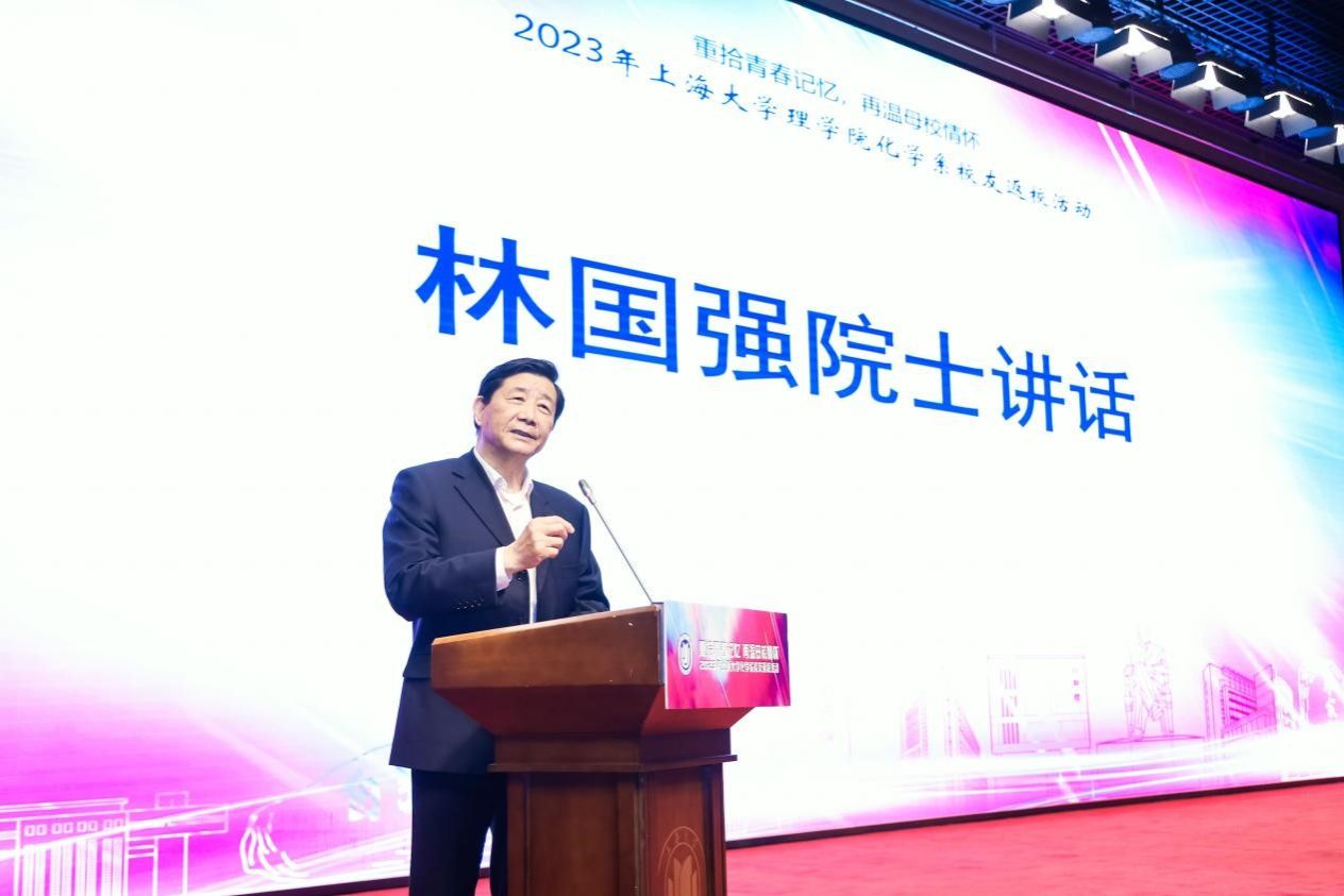 随后,林国强院士讲话,林院士回顾了在母校学习奋斗的经历,回忆了当年的老领导、老师对于学生们真诚的关爱与教导,表达了对母校、老师同学们深厚的感情,他勉励校友、师生们要守正创新、扬帆奋楫,传承发扬化学人的拼搏奉献精神,做好强国复兴的新时代接班人。林院士一直关心并大力支持母校和化学系的建设和发展,他捐资设立国秀奖学金,九届已有158名化学系本科生及研究生荣获该奖学金,激励着莘莘学子在科研学习上砥砺前行。他在母校忆初心上党课,亲切地与师生们进行思想、学术交流,深受广大师生的崇敬和爱戴。