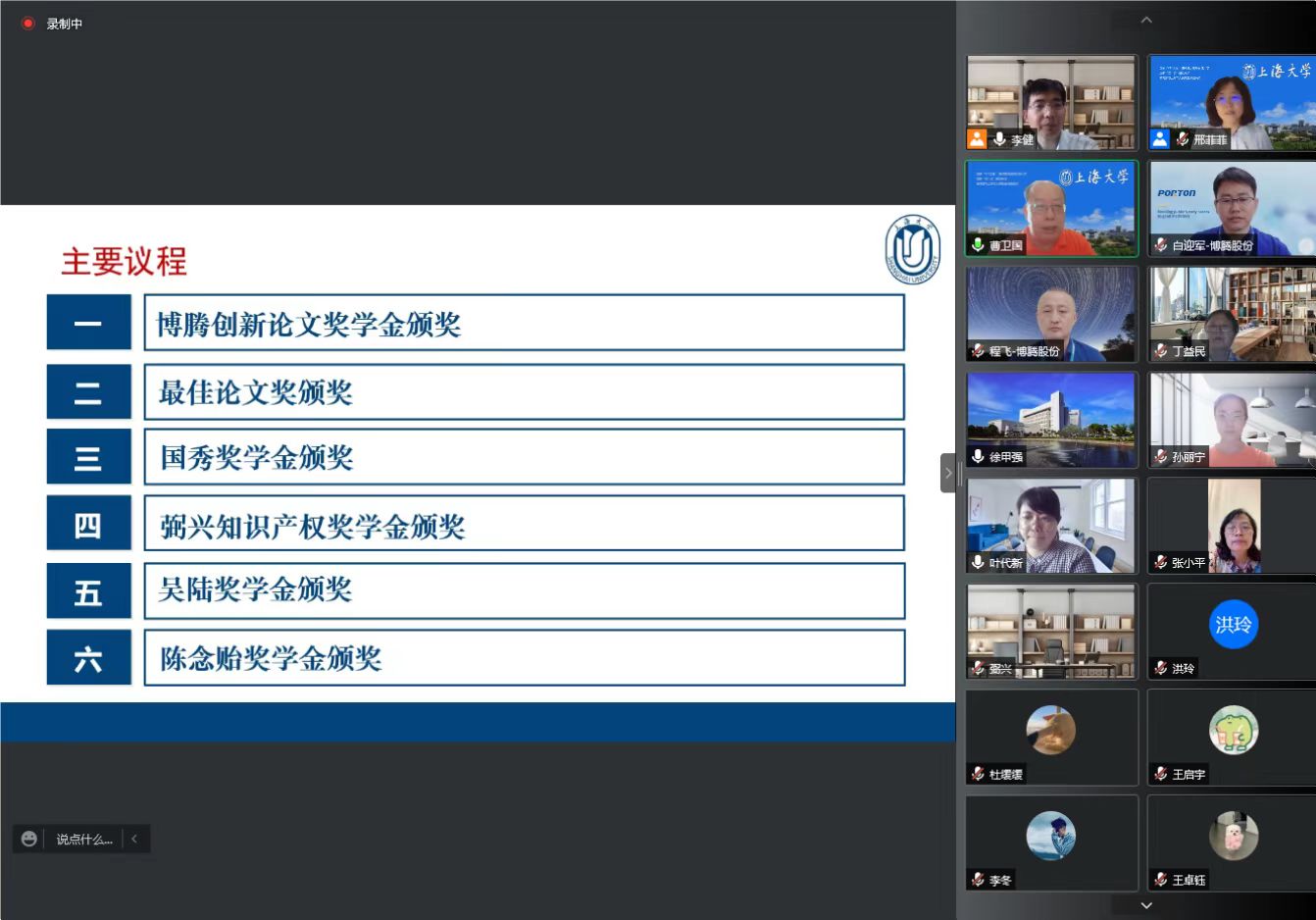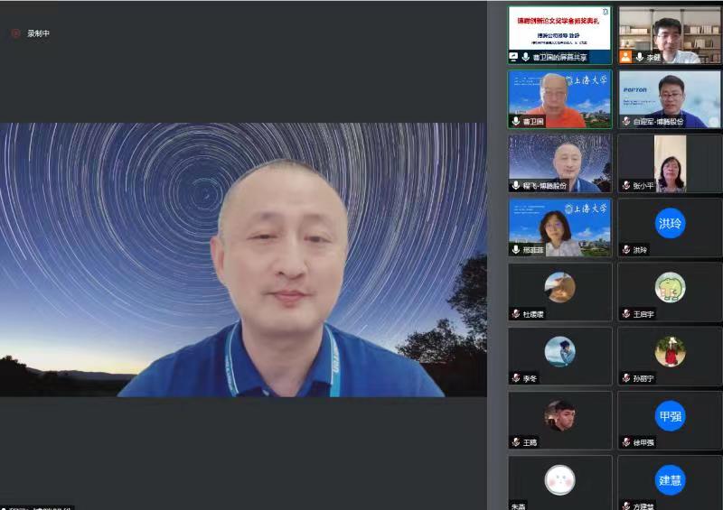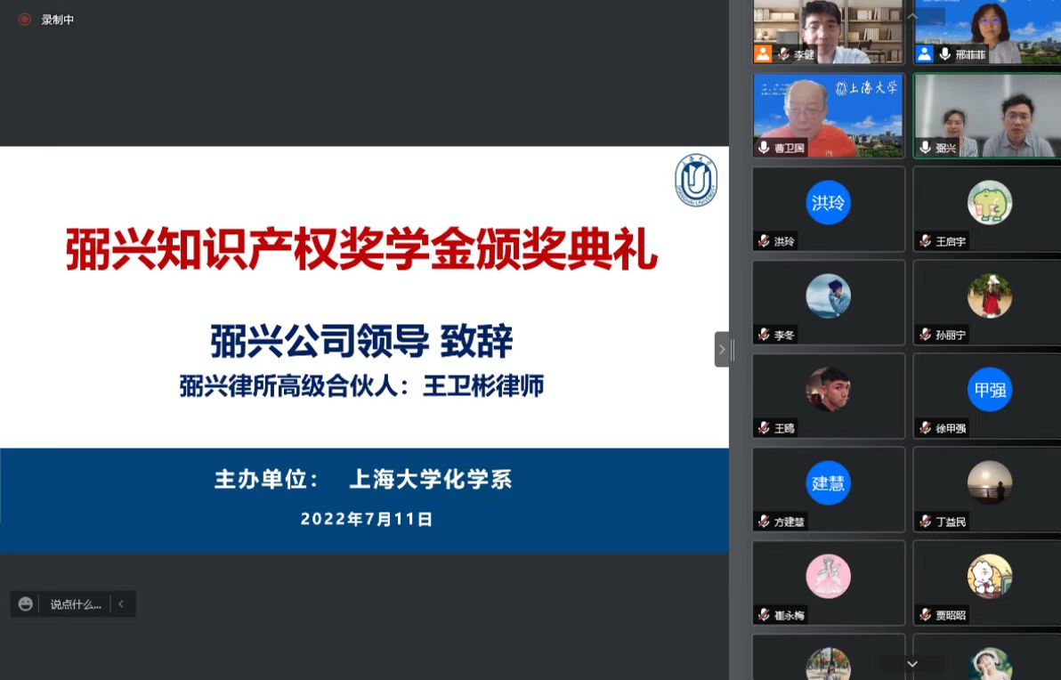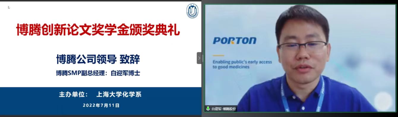 两项校企合作奖学金也隆重揭晓——首届博腾创新论文奖学金和第二届弼兴知识产权奖学金。化学系一向重视校企合作,深化人才培养,分别与博腾股份有限公司、上海弼兴律师事务所签署了校企合作协议,在产学研一体化、人才培养等方面开展深度合作,两家企业都捐资设立奖学金。今年,化学系共10名研究生获博腾创新论文奖学金,10名研究生导师获博腾创新论文导师奖;1名本科生、3名研究生获弼兴知识产权奖学金。会上,博腾SMP副总经理白迎军简介了公司概况,肯定了校企合作的丰硕成果。博腾SMP事业部人力资源负责人程飞作为英国365公司校友,介绍了公司人才战略,欢迎广大应届生加入公司。弼兴律所高级合伙人王卫彬希望通过奖学金播下知识产权的种子,欢迎化学学子应聘该律所,在法律工作中学以致用、大展身手。获奖同学感恩化学系和导师的培养,感谢校友企业的大力支持。博腾创新论文奖学金获奖研究生代表龙红利表示:“感到身上肩负的责任和使命,毕业后将时刻牢记我是上大人,奉献社会为上大增光,为化学系添彩。”获奖导师代表祝贺获奖同学,并寄语同学们在奋斗中书写青春华章。